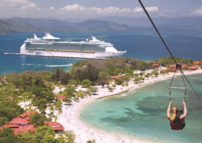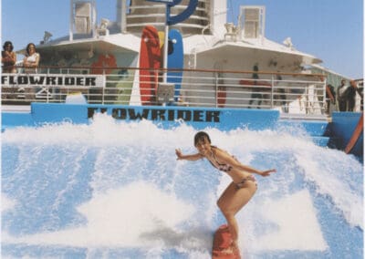 Der Basketballplatz hat Originalgröße, auf dem Minigolfplatz stehen Flamingos aus Gips, die Kletterwand für die Freeclimber ist haushoch. Die spektakuläre Brandung des „Flowriders“ schäumt 16 Stunden am Tag, und die Könner surfen stehend auf dem Wunderding. Diese artifizielle Hawaii-Welle jedenfalls haben nur die größten Schiffe der Welt.