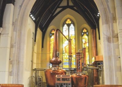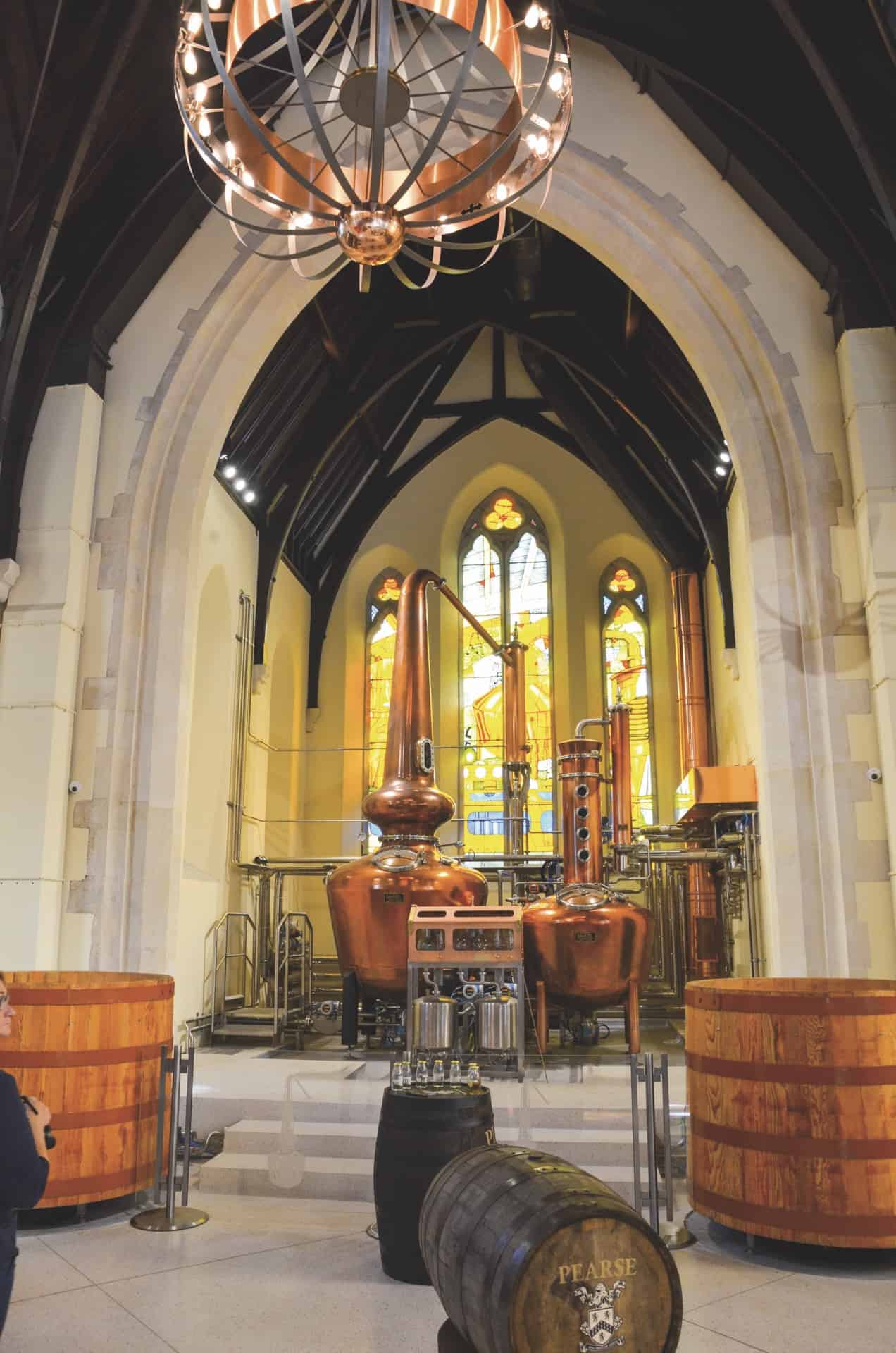 Nicht weit entfernt und ebenfalls in Nachbarschaft der Guinness-Brauerei eröffnete im Spätsommer in einer renovierten Kirche der Unternehmer Pearse Lyons seine gleichnamige Destillerie. An dem Platz, wo bereits seine Vorfahren auf einem uralten Friedhof ruhen, baute er in der ehemaligen Kirche von St. James seine außergewöhnliche Brennerei. Er holte aus Kentucky zwei Pot Stills – ungewöhnlich genug für die Bourbon-Herstellung – und ließ zunächst außerhalb Dublins in Carlow destillieren, bis nun die renovierte Kirche ihr neues Zuhause wurde. Neben den Brennblasen ist auch deren Zahl – nur zwei – und die Nutzung frischer Bourbon-Fässer – also nicht neu ausgekohlter – eine Besonderheit der Pearse-Lyons-Marke. Auch hier plant man, wie bei Teeling, die erste Charge aus der eigenen neuen Destillerie für nächstes Jahr – solange wird aus eingekauften bzw. vorab gebrannten Destillaten abgefüllt. Der Charakter der Whiskeys aus der St. James Destillerie ist überraschend fruchtig, bis auf den Reserve Malt, der komplett aus Kentucky-Beständen stammt.