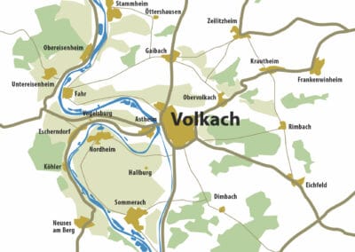 Die Weinbaugemeinden dieser Insel sind Nordheim, Sommerach und Hallburg mit ihren bekannten Lagen Nordheimer Vögelein und Sommeracher Katzenkopf. Das Terroir dort ist mehr als die Summe seiner Teile: Boden und Mikroklima, Lagen und Hangneigungen der Weininsel haben ihren Ursprung in den Tiefen der Zeit – vor rund 200 Millionen Jahren. Heute prägen Muschelkalk und Keuper die Weininsel und ihre Weinlagen.
