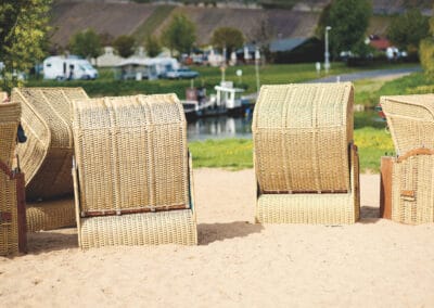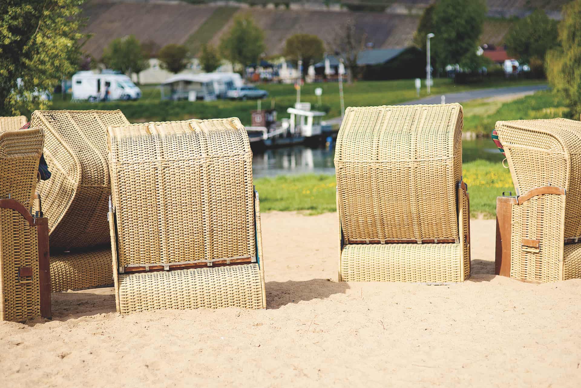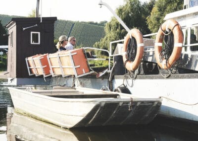 Was braucht eine Insel zuallererst? Sie braucht einen schönen Strand! Also haben die InselWeinMacher am Mainufer einen Strand aufgeschüttet, direkt neben der Anlegestelle der Fähre nach Escherndorf – mit Blick aufs „Festland“ und die berühmte Weinlage Escherndorfer Lump, wo auch DIVINO einige Weinberge bewirtschaftet. Strandkörbe wurden angeschafft und natürlich auch ein Inselwein gekeltert. Eine rote und eine weiße Cuvée der Betriebe: unkompliziert, frisch, frech, fruchtig. Ein Sommerwein ist das, den man am Strand der Insel genießen kann. Aber die Winzer von der Insel haben sich nicht nur mit diesem Weinprofil auseinandergesetzt. Ihr Ziel war und ist es noch heute, die Potenziale des Terroirs der Weininsel herauszukitzeln und in ihren Weinen erlebbar zu machen.